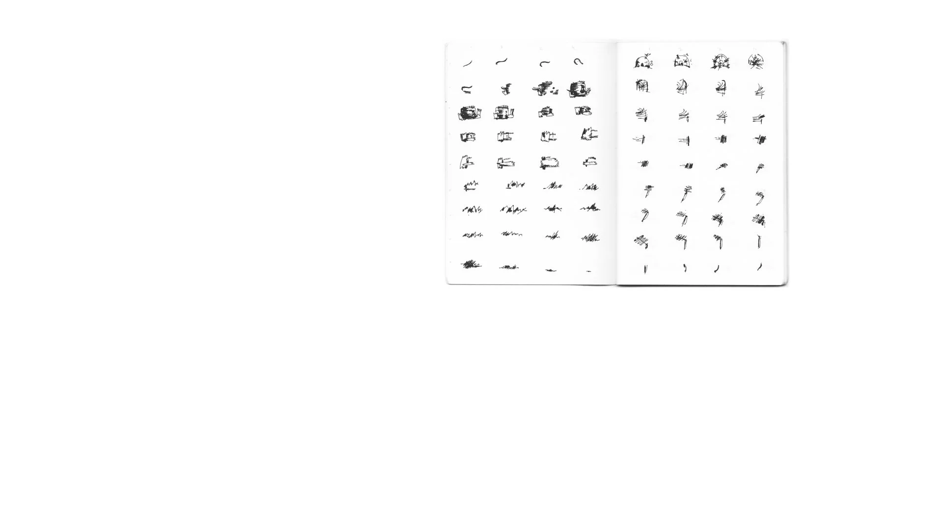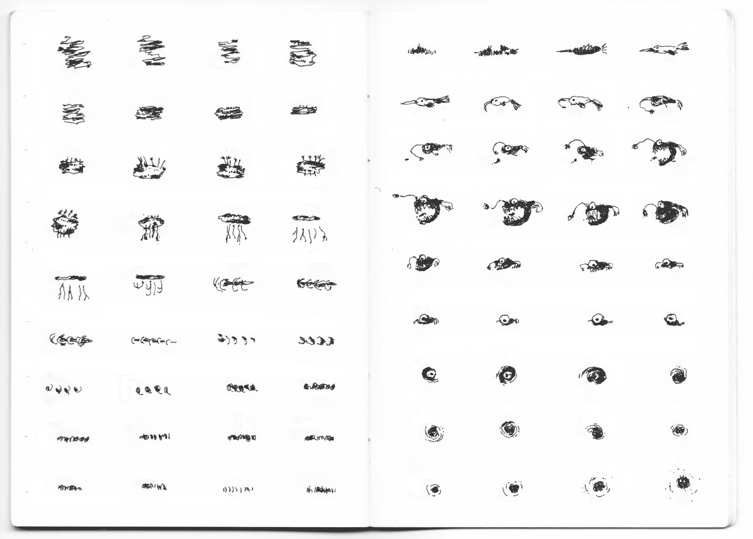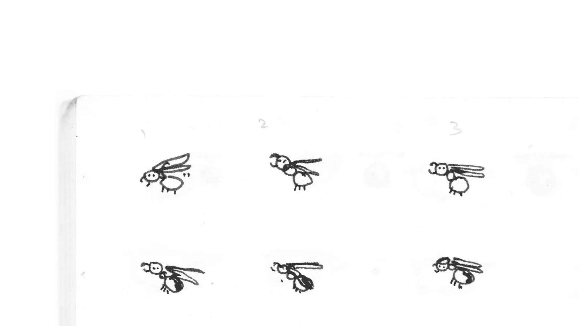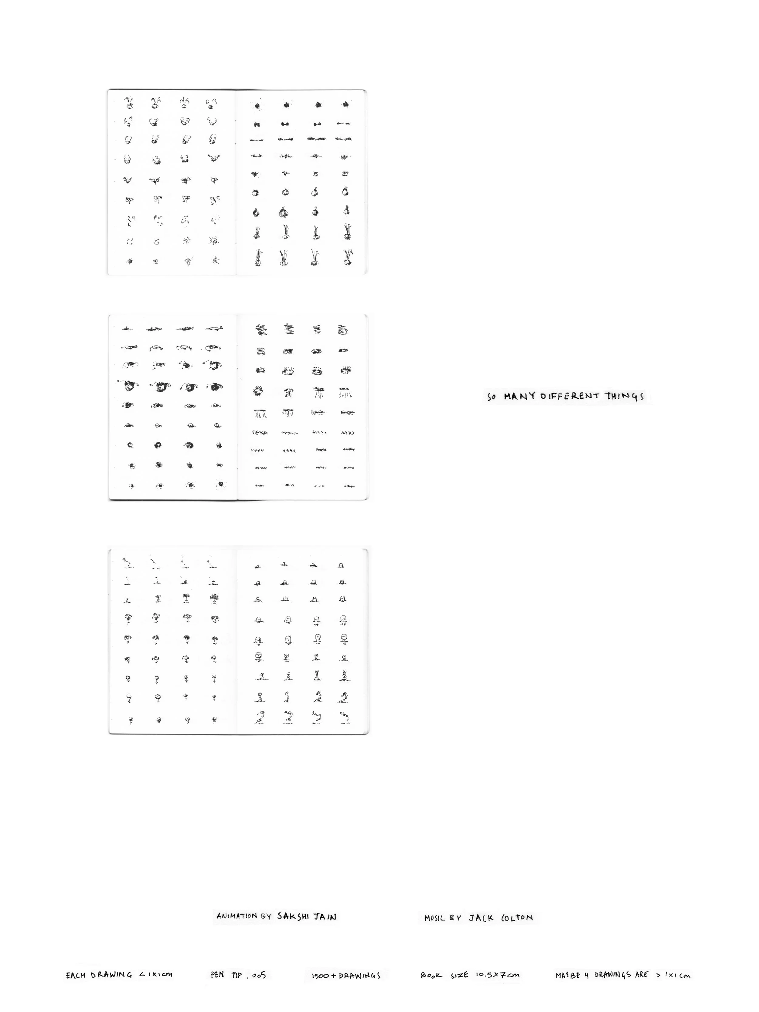A collection of things drawn sequentially in a mini sketchbook, hoping they animate. Each drawing is about a centimeter in size.